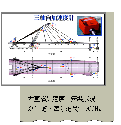 先進的工程技術 為達成業主分析上之要求,本公司於大直橋安全監測工程採用之加速度計,經本公司專業程式系統設計後,可達39頻道、每頻道同時最快500Hz(即每秒500筆X 39頻道)之速度。為目前業界動態量測效率最佳之系統,且程式設計均由本公司之研發人員執行,使得系統的”客製化”程度可達100%。此項技術在國內不僅極為先進,連許多先進國家來臺訪問之學者,在參觀本工程後亦極為讚賞。 |