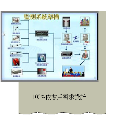 100%依客戶需求設計 本公司設計之監測系統,從現場調查、設備選擇、現場施工到系統整合完成,一切均由本公司員工完成,因此可100%依客戶需求設計。絕對不允許受制於國外原廠的情況發生。 |