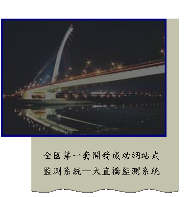 全國第一套開發成功網站式監測系統—大直橋監測系統 公司之橋樑監測工程為國內最專業之監測廠商,舉凡新式之斜張橋,或老舊RC結構橋樑。本公司均有極為眾多且良好之監測實績及經驗,本公司並曾連續三年穫公路總局評定為監測成果最優良之廠商。穫得廣大業主及各大顧問公司一致肯定。並多次與國內知名大學合作進行橋樑安全監測研究,為國內最先進之橋樑監測廠商。 |