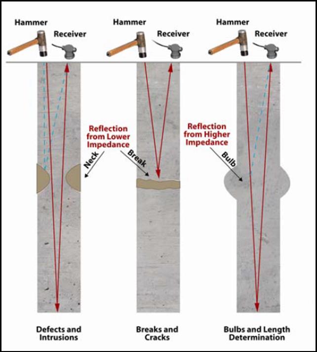 木材木樁完整性應力波檢測是從基樁的頂部(或上側)進行了低應變完整性測試,如下面的圖中。測試設備包括一個3磅(1.36 kg)重的錘,接收器安裝在基樁的頂部(或上側),和一個數據採集平台。測試需要在地基上面用錘子產生波能量傳播到地基底部。波經過不規則反射(裂痕,頸部,燈泡,土壤入侵,空隙等)到達基樁底部,並反射回到基樁頂部。接收器在基樁上測量,每次撞擊的振動都會收到震波。在數據採集平台採集,處理並顯示接收器輸出。基礎長度和混凝土的完整性是通過識別和分析的到達時間,震波的方向和振幅是由接收器中的時間測量出來的。迴聲深度(D)是由壓縮波速度(V)乘以反射時間(t),再除以該數量由2,公式為D = V* T / 2。 利用木材木樁完整性應力波檢測分析長度或是完整性評估的基礎是基於反射訊號的辨識和完整性。試驗結果被用在分析SE方法的時域分析。