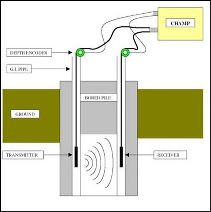 無暇疵之均質混凝土,其音波傳遞速度是一固定值,若混凝土中含土壤、灰泥或出現蜂窩時,則其音波之傳遞速度將降低。 跨孔超音波試驗超音波檢測乃依據此種不同品質之混凝土具有不同之音波傳遞時間的現象,利用音波檢測儀之收、發波器,置入連續壁之檢測管內,藉由音波傳遞之速率與深度關係圖形,再依據此記錄曲線圖形加以分析研判混凝土品質的良莠及缺陷。